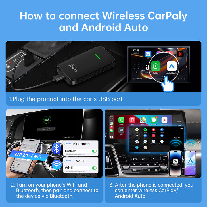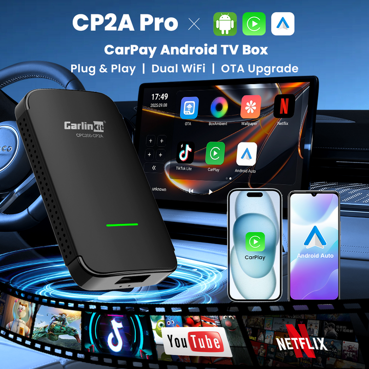 Carlinkit CP2A Pro is a 3-in-1 wireless adapter that integrates Android Auto, CarPlay, and an Android TV box, designed for seamless in-car entertainment and connectivity.